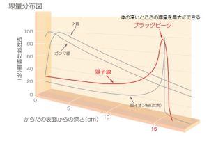 当院では、さまざまな悪性腫瘍に対して陽子線治療を実施しています。陽子線治療は水素の原子核である陽子を光速近くまで加速してがん細胞に当てることで、がん細胞を死滅させる新しい放射線治療です。従来の放射線治療は体表面に強く当たり、深いところでは弱くなってゆくのに対して、陽子線は深いところにエネルギーのピーク(ブラッグピークと呼びます)を作ることができます。そのため体の正常の部分の障害を減らしながら体の深いところにある腫瘍に強い放射線を照射することができます。